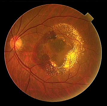 近年日本においても患者数が急増してきた疾患です。網膜の中心である黄斑部分に、新生血管というもろい血管が生えて出血や浮腫がでてくる病気です。中心部分が障害されてしまうため、病初期から視力が落ちる、ゆがむ、見たい部分が見えないなどの症状が出ます。中心部分の病気であるため手術やレーザー治療など積極的な治療をしづらく、現在ではPDT(光線力学療法)や眼内に薬を注射して、新生血管を小さくしたり浮腫を軽減する治療が多く行われています。