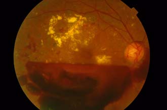糖尿病が原因で、カメラでいえばフィルムにあたる部分である網膜が傷んでくる疾患です。血糖が高い状態が続くと、網膜の血管が傷んで血液循環が悪くなり、結果として新生血管というもろくて破れやすい血管が生えてきます。この血管が切れると硝子体出血となって視力が落ち、また増殖膜という新生血管が豊富な膜が生じてくると、網膜を引っぱって網膜がはがれてくる牽引性網膜剥離になります。病気の進行期にあたる増殖期になると網膜光凝固というレーザー治療が必要となり、さらに進行して硝子体出血や牽引性網膜剥離、黄斑浮腫などを生じてくると、硝子体手術の適応となります。糖尿病網膜症は緑内障と並んで、成人してからの失明原因の大きな部分を占めます。増殖期になってもまったく自覚症状がないことが多く、視力が悪くなってから眼科を受診した場合、病状がかなり進行している場合が多く見られます。糖尿病のある方は、自覚症状のあるなしにかかわらず失明予防のために定期的な眼科受診が必要です。